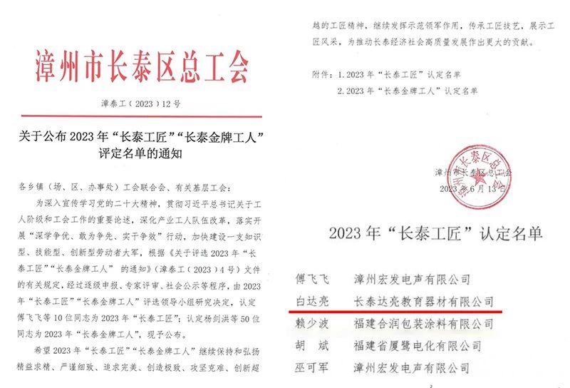 2023年6月漳州市长泰区总工会公布了2023年“长泰工匠”评定名单的通知:长泰达亮教育器材有限公司总经理白达亮被授予2023年“长泰工匠”荣誉称号。获此殊荣,离不开他多年在产品研发设计过程中秉持匠心匠人之心的理念,着眼于客户实际需求。在2022年福建省百万职工“五小”创新大赛中,他设计的手摇式课桌椅产品荣获二等奖,为弘扬工匠精神,激发创新活力做出新贡献。